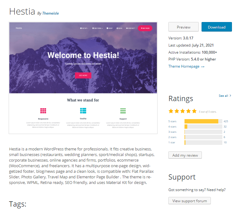 Hestia هو قالب WordPress حديث للمحترفين، يناسب الأعمال الإبداعية والشركات الصغيرة والوكالات والشركات عبر الإنترنت والتجارة الإلكترونية (WooCommerce) وأصحاب الأعمال الحرة.